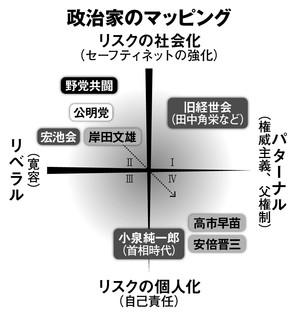 中島 もうひとつ、今回の野党共闘が成立している背景には、自民党が以前にも増して「自助」を強調するようになっていることがあります。かつて田中角栄さんが首相の時代(1972~74年)は、日本的な温情主義を使ったきわめて不透明な形であったものの、再分配をやっていて、再分配を重視していました。Ⅰのゾーンです。しかし90年代に自民党は小さな政府の議論を取り入れ、自己責任という方向に向かっていった。小泉純一郎内閣以降は明らかにそちらに舵をきった。これに対して出てきた、セーフティネットを重視し、リスクを社会化していくために、もうひとつの選択肢をつくろうという動きが野党共闘の背景にはあります。