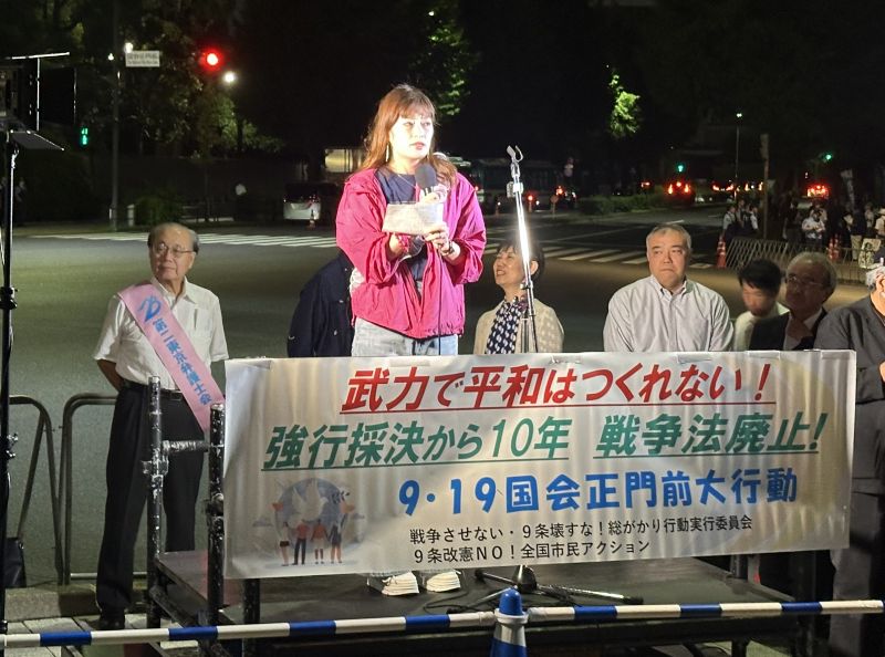 集団的自衛権行使を容認する安全保障関連法(安保法制)の強行採決から10年が経った9月19日夜、国会正門前で大規模な抗議行動があった。約2300人が参加し、軍拡の動きや排外主義に反対するスピーチなどが繰り広げられた。
